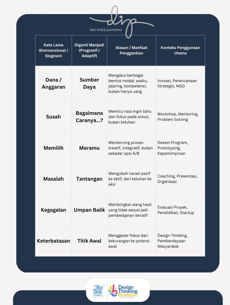 Maka jika tim kita buntu, jangan buru-buru ganti framework. Coba dulu dengarkan bahasanya. Apakah sudah memberi ruang untuk berpikir divergen, atau justru memperkuat pola pikir konvergen yang serba takut salah? Di era ketidakpastian, kita butuh lebih dari sekadar metode. Kita butuh cara bicara yang menumbuhkan keberanian berpikir beda. Karena dari sana, inovasi lahir🚀