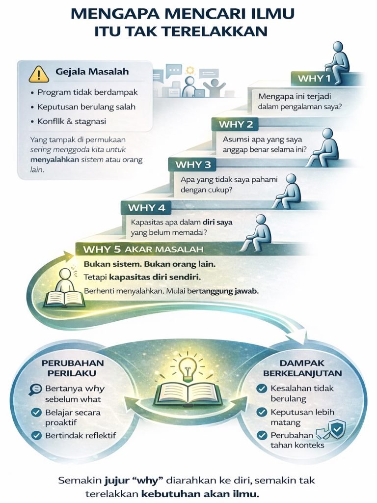 Ketika why terus ditarik ke pengalaman manusia, termasuk diri sendiri, fokus perubahan pun bergeser secara radikal. Masalah tidak lagi dipahami sebagai “kurangnya anggaran”, “lemahnya regulasi”, atau “rendahnya partisipasi”, melainkan sebagai cerminan dari kapasitas diri yang belum cukup untuk membaca kompleksitas, memahami dampak, dan merespons dengan tepat. Kesadaran ini sering kali menyakitkan, karena ia menuntut pengakuan bahwa niat baik tidak selalu cukup tanpa kedalaman pemahaman.