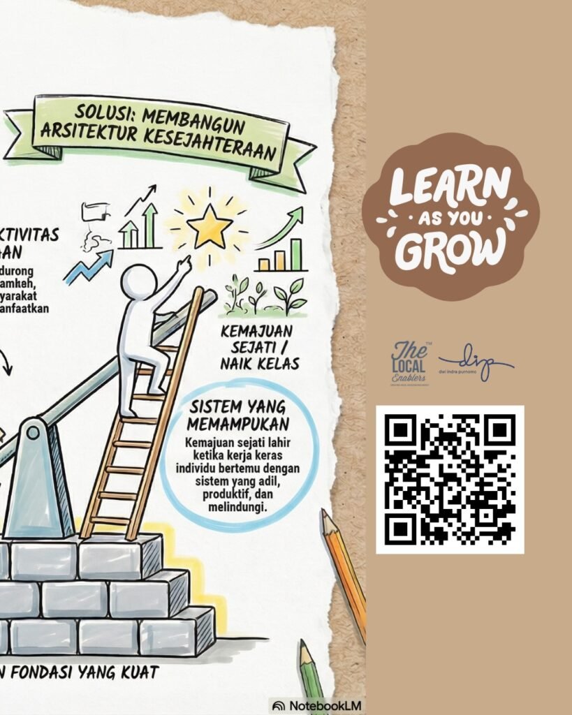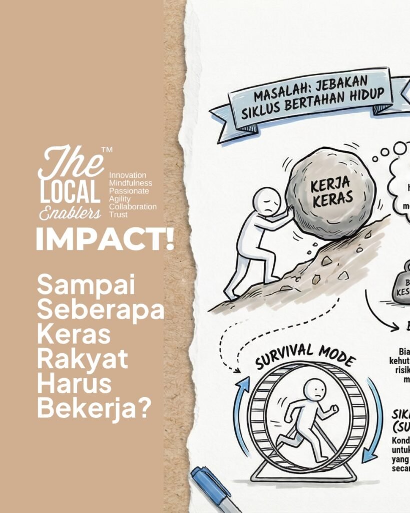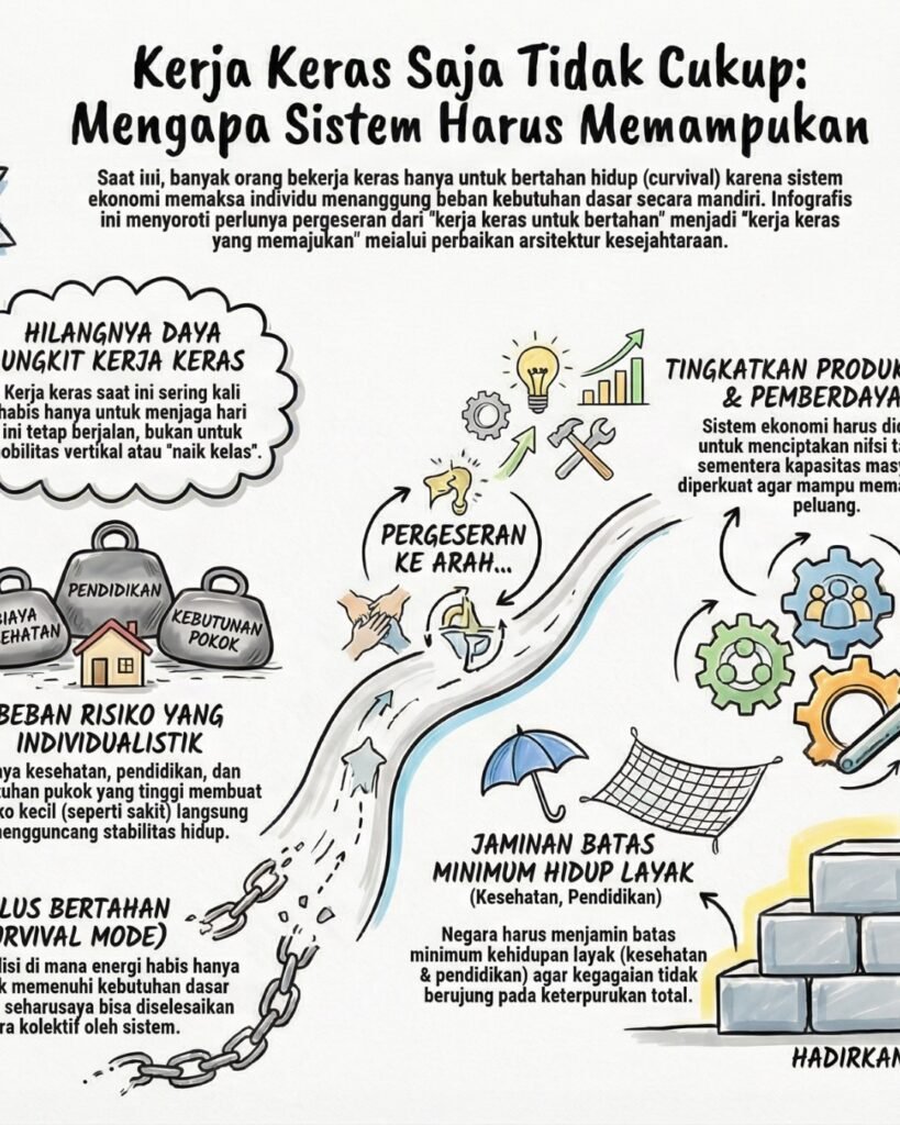 Masalahnya bukan pada individu yang kurang gigih. Masalahnya ada pada sistemnya. Ketika akses terhadap kesehatan, pendidikan, dan perlindungan sosial masih rapuh, setiap guncangan kecil bisa meruntuhkan segalanya. Sakit sebentar. Kehilangan satu kontrak. Harga yang tiba-tiba naik. Hal-hal yang seharusnya hanya menjadi hambatan sementara, berubah menjadi krisis. Di sinilah kerja keras kehilangan fungsinya, bukan lagi tangga menuju kemajuan, melainkan roda yang berputar di tempat.