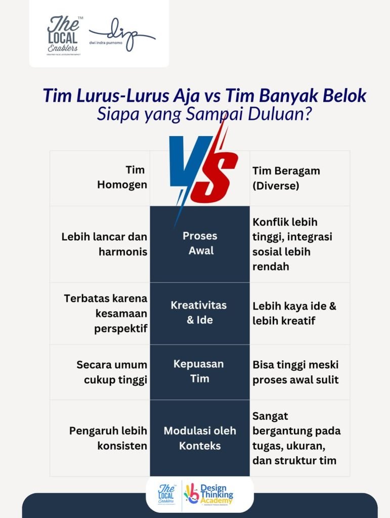 Masalahnya, banyak pemimpin terjebak euforia “punya tim beragam” tanpa sadar bahwa perbedaan yang tak dikelola akan meledak di wajah mereka. Perbedaan cara kerja, nilai, dan prioritas (deep-level diversity) bisa memicu task conflict yang sehat, tapi lebih sering berubah jadi relationship conflict yang menghancurkan kohesi (Jehn, 1995). Horwitz & Horwitz (2007) menambahkan, tanpa mekanisme kolaborasi yang jelas, keberagaman justru memperlambat kerja. Apalagi jika faktor-faktor seperti jumlah anggota yang terlalu besar, tugas yang rumit, dan durasi kebersamaan yang singkat tidak diantisipasi (Stahl et al., 2009).