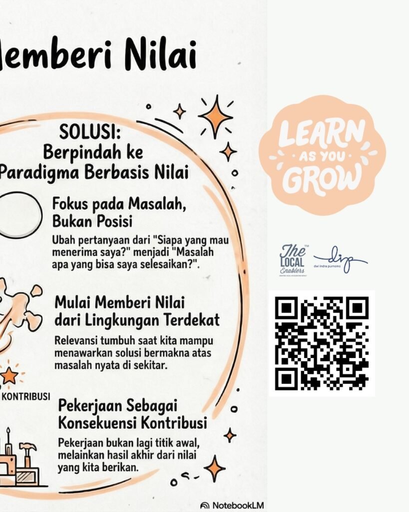 Maka yang perlu diubah bukan hanya strategi, tetapi cara berpikir. Dari “mencari kerja” menjadi “mengambil peran dalam menyelesaikan masalah.” Pertanyaannya bukan lagi “siapa yang mau menerima saya?”, tetapi “di mana saya bisa mulai memberi nilai?” Siapa saja yang mampu mengidentifikasi masalah nyata dan menawarkan solusi yang terbukti dan bermanfaat, pada akhirnya akan menciptakan ruang kerjanya sendiri. Dalam dunia yang semakin kompleks, pekerjaan bukan lagi titik awal, melainkan konsekuensi dari kontribusi nyata yang bermanfaat🙌.