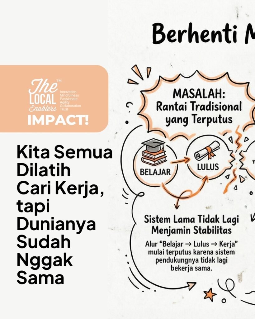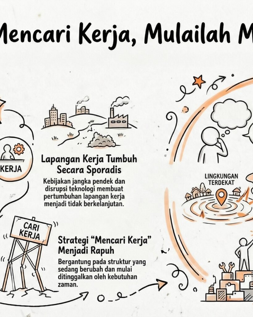 Yang dibutuhkan bukan lagi cuma sekadar tenaga kerja, tetapi kemampuan membaca masalah, menghubungkan aktor, dan menciptakan nilai dari kompleksitas. Strategi hidup bertahan para lulusan yang basisnya “mencari pekerjaan” menjadi sangat rentan justru karena bergantung pada struktur yang sedang ditinggalkan.