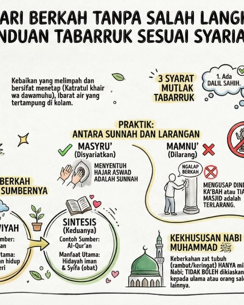 Tabarruk adalah ibadah, bukan sekadar tradisi atau simbol. Karena itu, ia harus tunduk pada wahyu. Tidak semua tempat, benda, atau orang bisa dianggap membawa berkah tanpa dalil yang sahih. Caranya pun harus sesuai tuntunan Rasulullah ﷺ, dan keyakinannya harus lurus: yang memberi berkah hanyalah Allah. Menetapkan sesuatu sebagai sebab tanpa dasar syariat termasuk syirik kecil; meyakini benda memberi manfaat secara mandiri adalah syirik besar. Kekeliruan ini sering lahir bukan dari niat buruk, tetapi dari kurangnya ilmu.