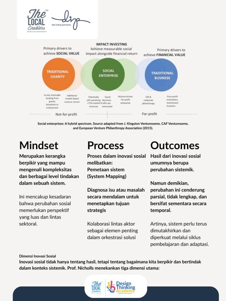 Inovasi sosial terdiri dari tiga dimensi penting: mindset, proses, dan outcomes. Mindset berarti kita mulai mengakui bahwa perubahan itu kompleks—bukan linier, dan tidak bisa diselesaikan satu aktor saja. Prosesnya menuntut kita untuk memetakan sistem, mendiagnosis akar persoalan, dan menyusun tujuan strategis bersama. Di titik ini, kolaborasi menjadi kunci. Namun, harus diakui juga bahwa hasil dari inovasi sosial seringkali bersifat parsial dan temporer. Karena sistem terus bergerak, maka inovasi pun harus bersifat adaptif dan terus belajar dari konteks yang berubah.