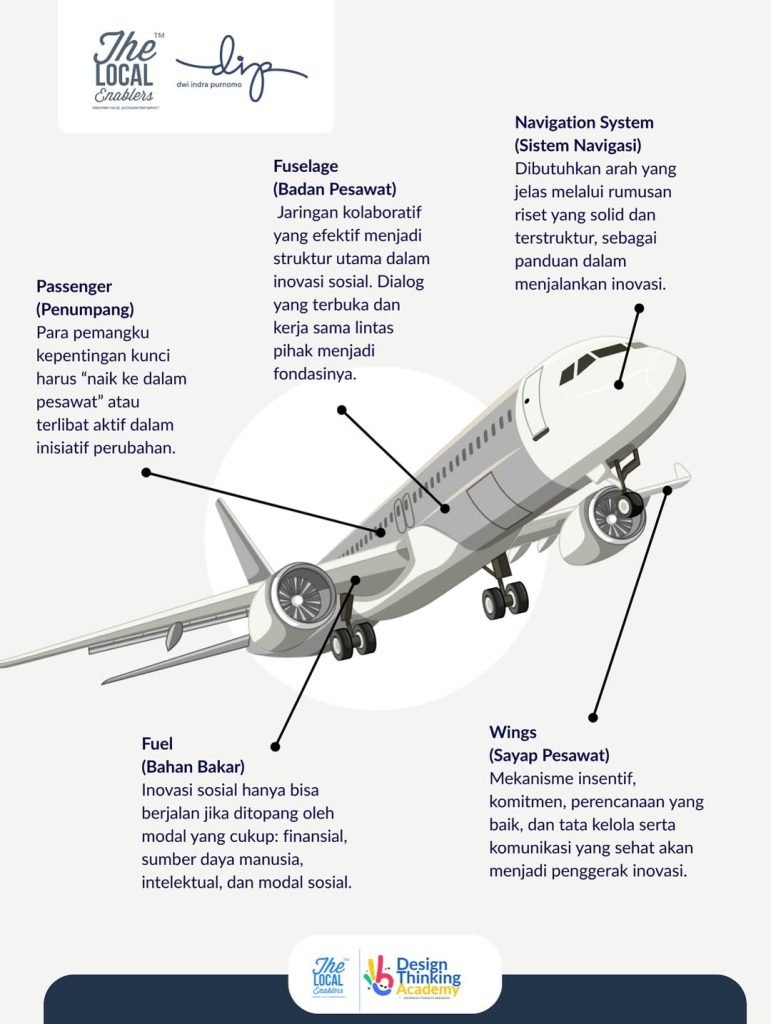 Prof. Nicholls menggambarkan inovasi sosial seperti pesawat terbang: butuh penumpang (stakeholder), navigasi (arah riset), bahan bakar (modal), badan pesawat (jejaring kolaboratif), dan sayap (insentif dan tata kelola). Intinya, perubahan sosial bukan kerja individu, tapi hasil kerja kolektif yang terbang karena semua elemen bergerak selaras✨