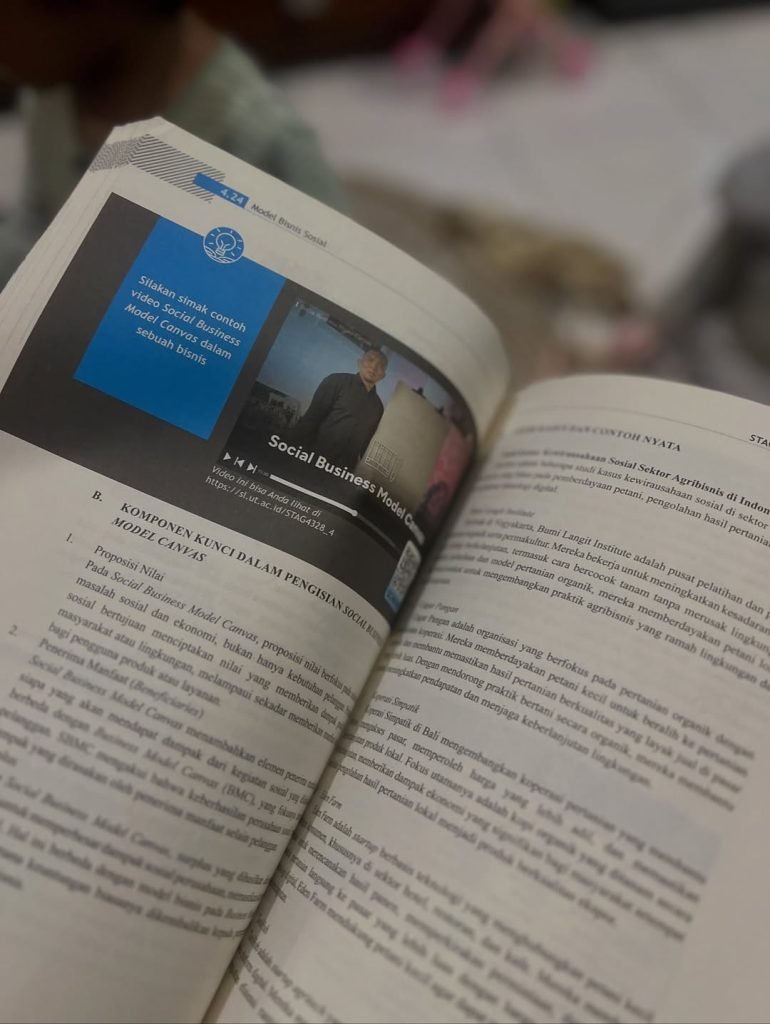 Yang membedakan modul ini adalah pendekatan yang digunakan. Semua topik dibangun dengan mindset design thinking dan ecosystem-based entrepreneurship, sehingga pembaca tidak hanya diajarkan cara memulai usaha, tetapi diajak memahami bagaimana menciptakan model bisnis yang kuat, relevan, dan mampu bertahan dalam perubahan zaman. Tidak ada teori kosong, semuanya dikaitkan dengan konteks Indonesia, lengkap dengan contoh nyata dari desa, UMKM, hingga model bisnis pertanian modern.