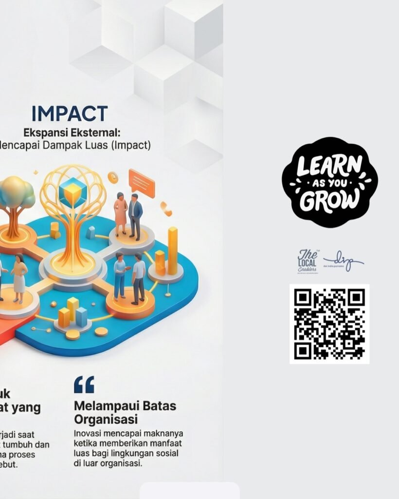 Lebih jauh lagi, inovasi mencapai makna terdalamnya ketika mampu menghasilkan impact; perubahan yang melampaui batas satu program atau satu organisasi. Impact lahir ketika inovasi terhubung dengan ekosistem yang lebih luas: komunitas, mitra, pemerintah, dan dunia usaha. Perubahan yang bertahan lama hampir selalu bersifat kolaboratif, bukan hasil kerja individu semata (Moore, 1996; Kania & Kramer, 2011). Pada titik inilah inovasi berkontribusi membentuk better society: masyarakat yang tidak hanya menjadi penerima manfaat, tetapi juga tumbuh, berdaya, dan berperan aktif dalam proses perubahan.