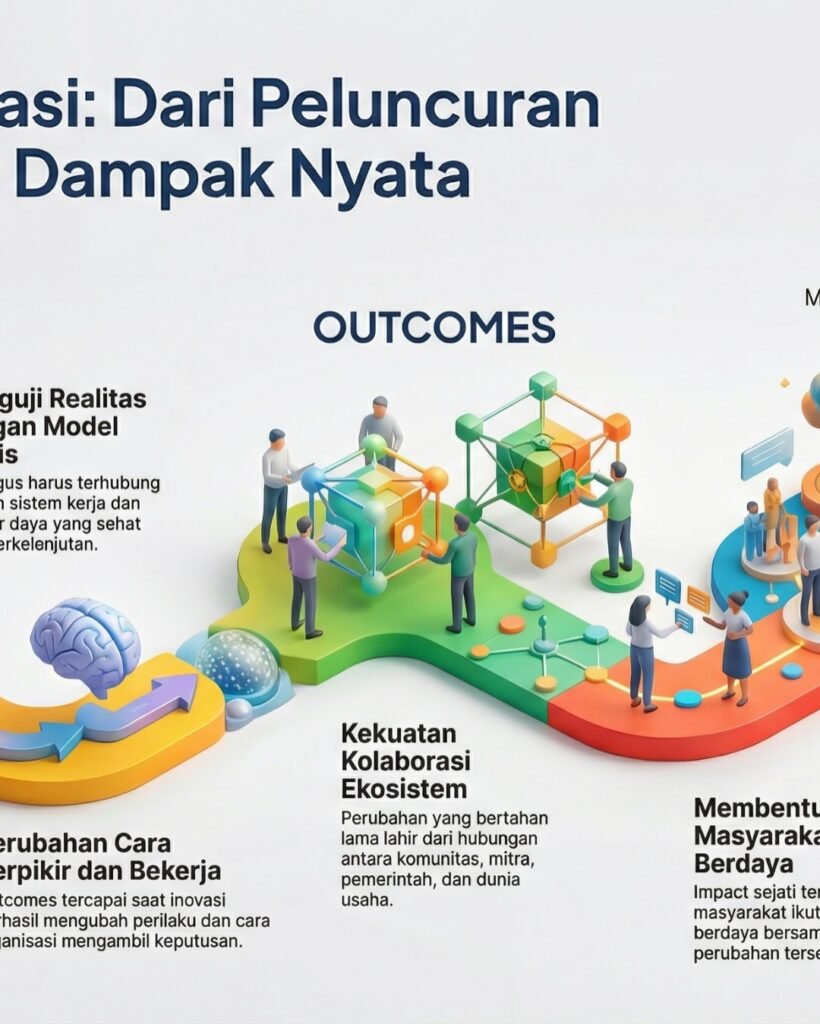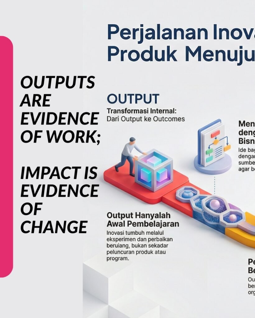 Melalui proses tersebut, output secara bertahap berkembang menjadi outcomes, yakni perubahan nyata dalam cara berpikir, bekerja, dan mengambil keputusan. Pada tahap ini, ide diuji oleh realitas organisasi: sistem, sumber daya, budaya kerja, dan keberlanjutan operasional. Tidak sedikit inovasi berhenti di tengah jalan karena gagal terhubung dengan model bisnis dan sistem kerja yang sehat. Tanpa fondasi yang kuat, ide yang baik hanya akan menjadi proyek sesaat. Oleh karena itu, Osterwalder dan Pigneur (2010) menekankan pentingnya mengaitkan inovasi dengan penciptaan nilai yang berkelanjutan.