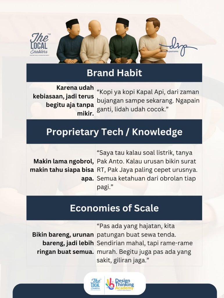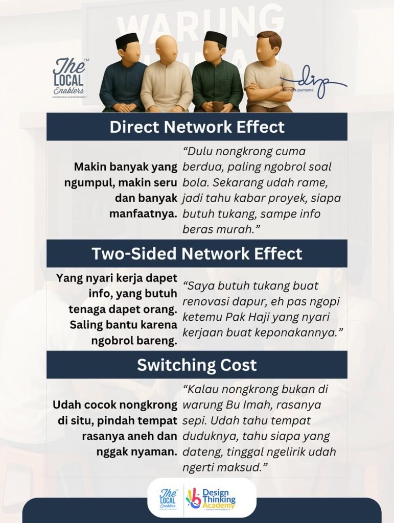 Obrolan ringan itu adalah arus data tak kasat mata. Mereka berbicara tentang siapa yang butuh tukang, siapa yang mau jual motor, siapa yang butuh pinjaman, atau bahkan kabar penting tentang tetangga. Di sinilah konsep network effect bekerja secara sosial: semakin banyak orang yang terhubung dalam jaringan tersebut, semakin besar nilai dan manfaat yang didapat setiap anggotanya (Shapiro & Varian, 1999). Masing-masing individu memperkuat kapasitas kolektif jaringan—mirip seperti apa yang terjadi dalam platform digital modern, tapi ini berbasis warung dan trust, bukan algoritma.