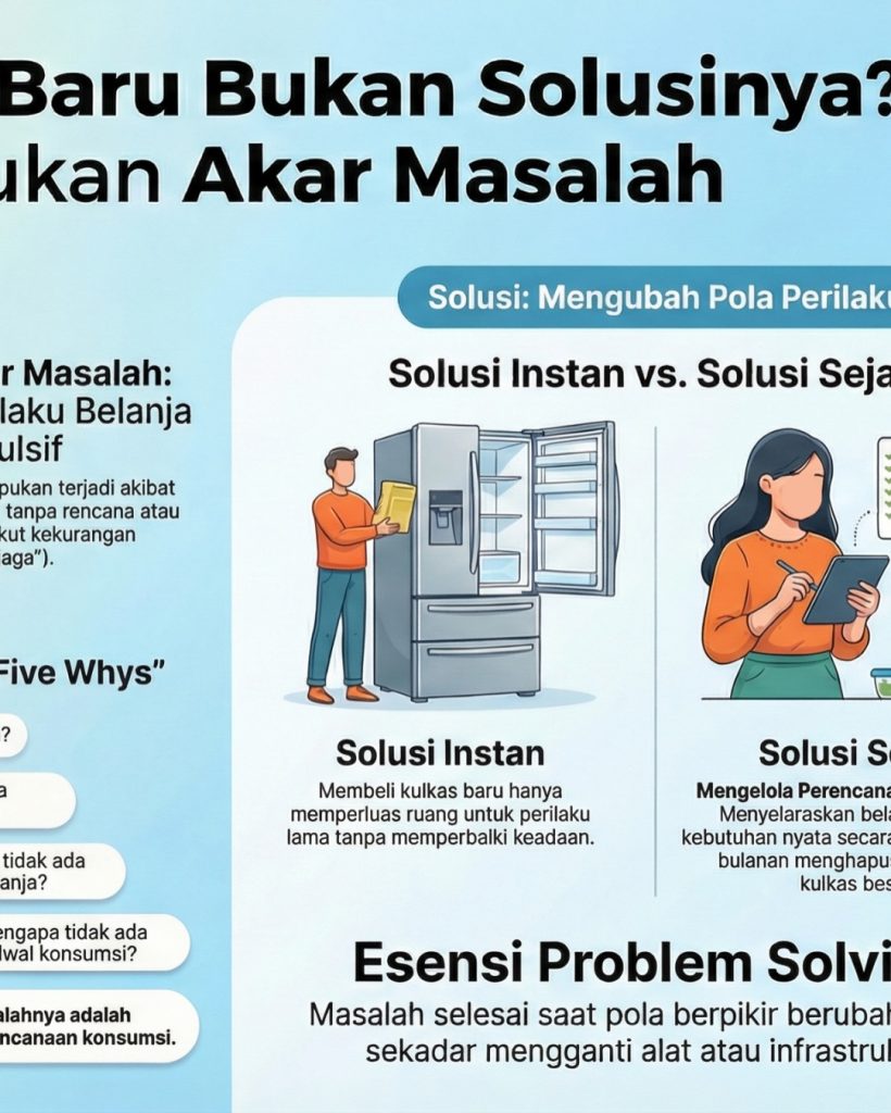 Dengan demikian, akar persoalan sesungguhnya adalah perilaku. Membeli kulkas yang lebih besar hanya akan memperluas ruang bagi kebiasaan lama dan menunda masalah yang sama untuk muncul kembali. Solusi yang lebih tepat adalah membenahi cara berpikir dan bertindak: merencanakan konsumsi, menyelaraskan belanja dengan kebutuhan, dan membangun disiplin dalam pengelolaan pangan. Ketika perilaku berubah, kebutuhan akan kulkas yang lebih besar sering kali menghilang, dan di situlah esensi problem solving yang benar-benar berkelanjutan.