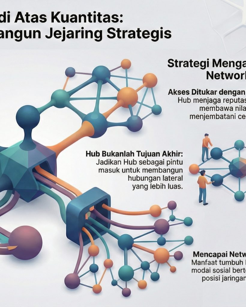 Namun, akses ke hub tidak bekerja secara otomatis. Hub menjaga kualitas jejaringnya dan hanya membuka akses kepada pihak yang memberi nilai tambah. Di sini relevan gagasan Ronald Burt tentang structural holes: individu yang efektif adalah mereka yang mampu mengisi celah antarjaringan dengan peran yang jelas dan kontribusi nyata. Artinya, kekuatan jejaring tidak diperoleh dengan menempel pada simpul kuat, tetapi dengan menjadi relevan dan dipercaya.