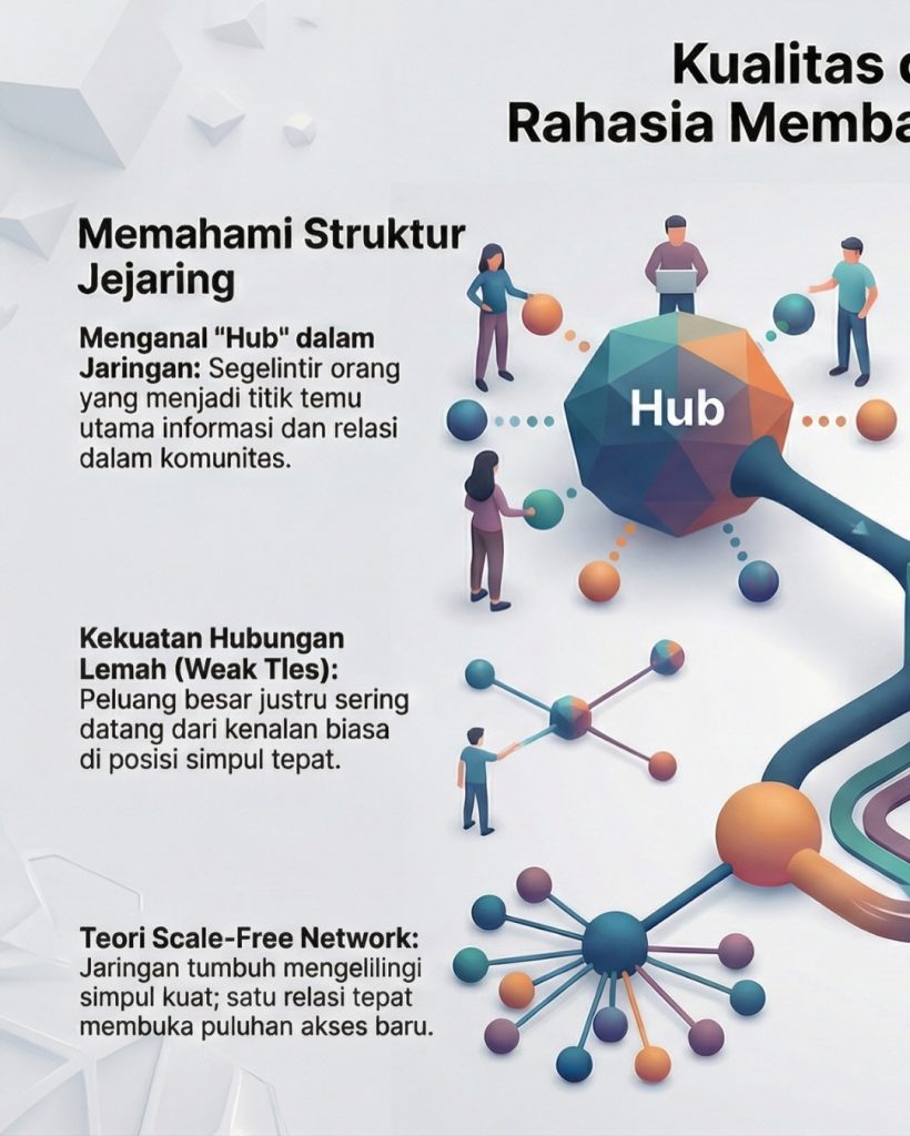 Dalam teori jaringan sosial, kekuatan jejaring tidak ditentukan oleh banyaknya relasi yang kita miliki, melainkan oleh posisi orang yang kita hubungi dalam jaringan. Di hampir semua jaringan sosial terdapat individu yang berperan sebagai hub, simpul dengan koneksi jauh lebih banyak dibandingkan yang lain. Pola ini dijelaskan oleh teori scale-free network, yang menunjukkan bahwa jaringan tumbuh melalui preferential attachment: koneksi baru cenderung melekat pada simpul yang sudah kuat. Karena itu, terhubung dengan satu hub berarti membuka akses ke banyak jejaring sekaligus.