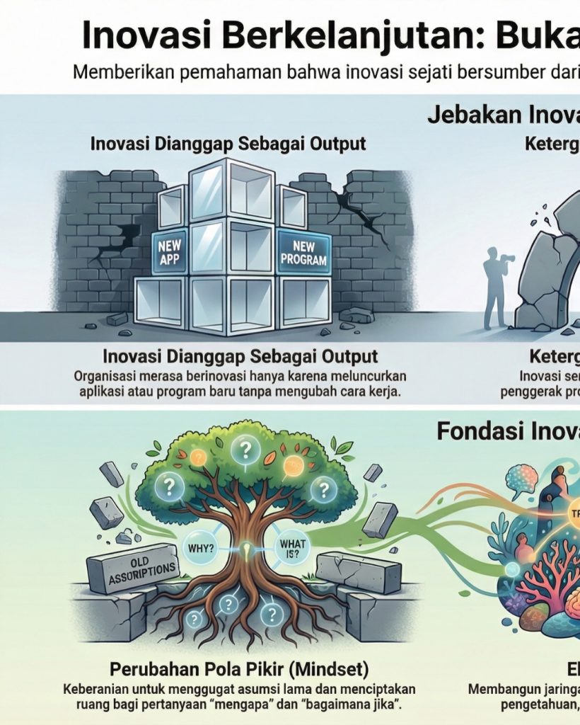 Produk, aplikasi, atau program baru hanyalah jejak yang terlihat di permukaan. Yang sering luput disadari adalah perubahan yang lebih sunyi namun menentukan: bagaimana individu dan organisasi mulai melihat masalah dengan cara berbeda, berani mempertanyakan asumsi lama & belajar dari ketidakpastian. Tanpa pertumbuhan cara berpikir ini, inovasi hanya menjadi peristiwa sesaat, bukan kemampuan yang menetap.