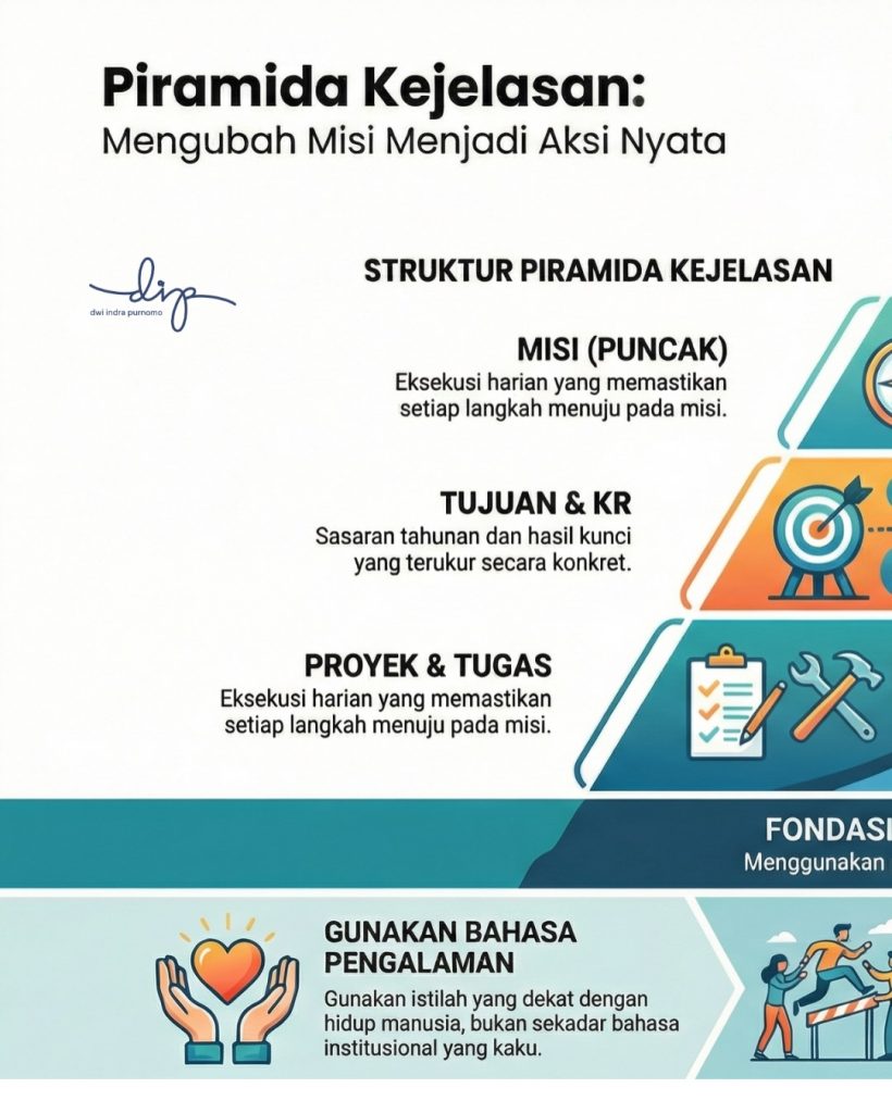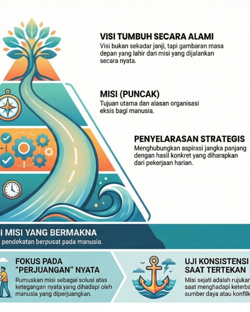 Misi yang mudah diingat tidak lahir dari kalimat yang indah, tetapi dari keberanian memilih manusia dan perubahan apa yang benar-benar ingin diperjuangkan. Karena itu, misi sebaiknya dirumuskan dengan bahasa yang dekat dengan pengalaman hidup target yang dituju, bukan sekedar istilah institusional yang aman.