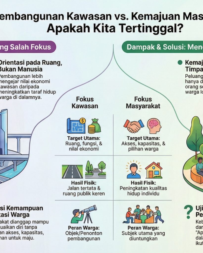 Banyak pembangunan dimulai dari ruang, dari fungsi lahan, nilai ekonomi, dan tampilan kawasan, dengan keyakinan bahwa manusia akan menyesuaikan diri. Kenyataannya tidak sesederhana itu. Masyarakat hidup dengan keterbatasan akses, kapasitas, dan pilihan. Ketika pembangunan tidak berangkat dari realitas ini, kawasan bisa tumbuh rapi, tetapi kehidupan warganya tidak ikut menguat.